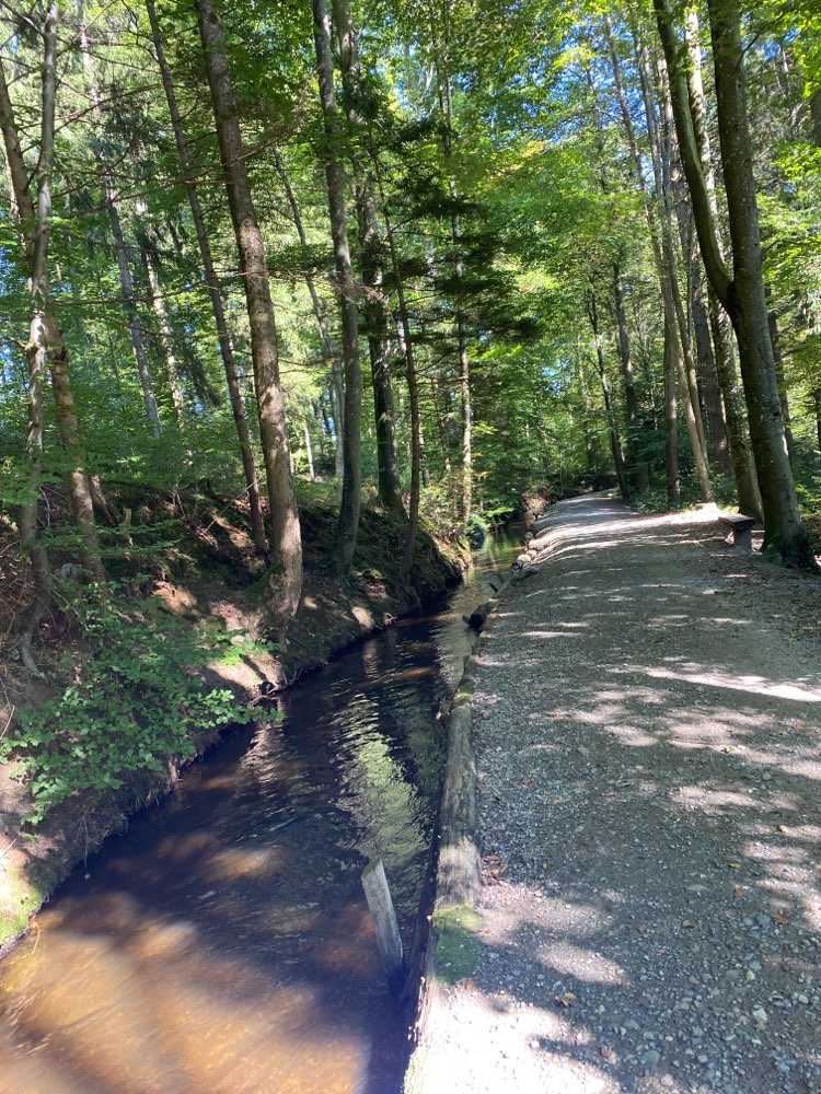 Super schöner Rundweg für heiße oder regnerische Tage. Der Bach ist nicht allzu tief und für Hunde eine super Abkühlung im Sommer. Bei Regen wird man nicht allzu nass, da es im Wald ist.
