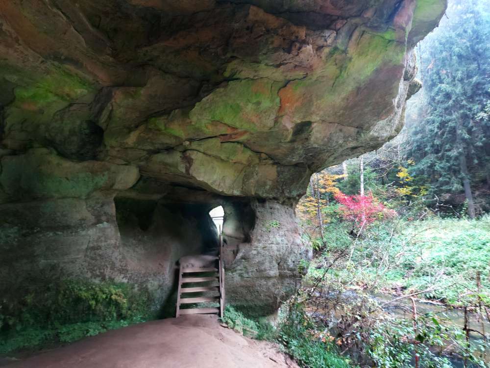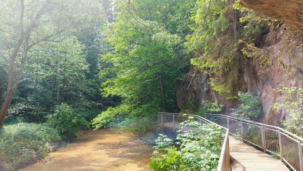Egal ob man unten in der Schlucht läuft oder oben im Wald zurück - es gibt Felsen, Höhlen, Bänke und Brücken.