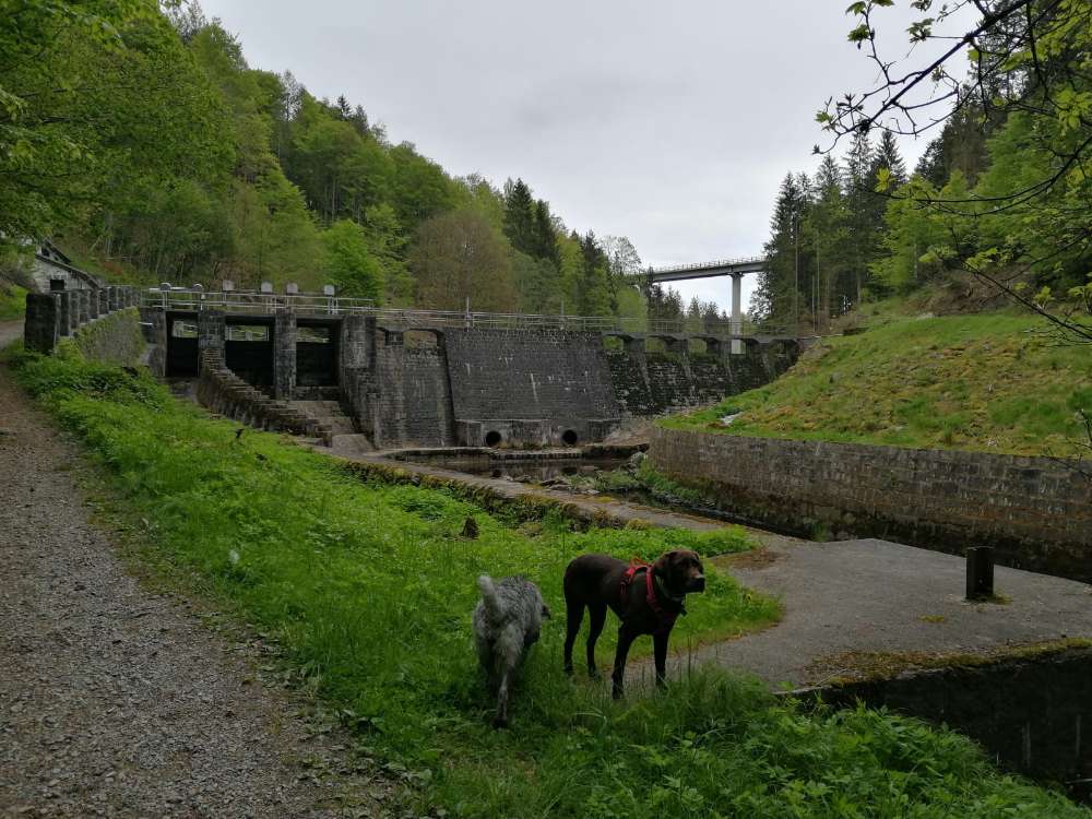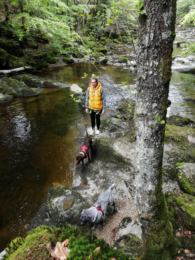 Schöner Wanderweg mit einem Bach in dem die Hunde sich abkühlen können.