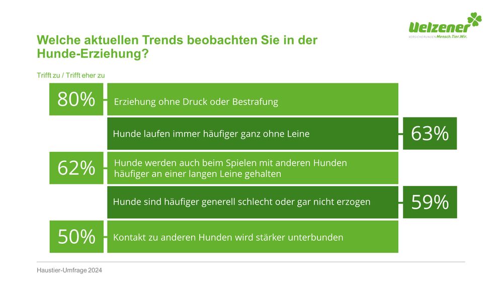Die Uelzener Versicherungen haben im Rahmen ihrer Haustier-Umfrage 2024 aktuelle Trends in der Hundeerziehung untersucht und interessante Einblicke gewonnen. Die Studie beleuchtet, wie Hundehalter:innen in Deutschland ihre Vierbeiner erziehen und welche Herausforderungen dabei bestehen. Ein zentrales Ergebnis: Ein Trend zu sanfteren Erziehungsmethoden, bei denen auf Strafen verzichtet wird, ist zu verzeichnen. Aber 59 % der Befragten klagen über schlecht oder gar nicht erzogene Hunde.