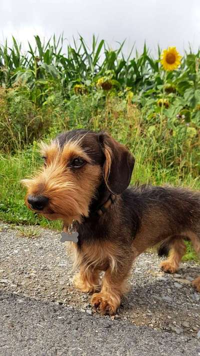 Sie ist ein Standard Rauhhaardackel, knapp 11 Monate alt und wiegt 7,3 kg.