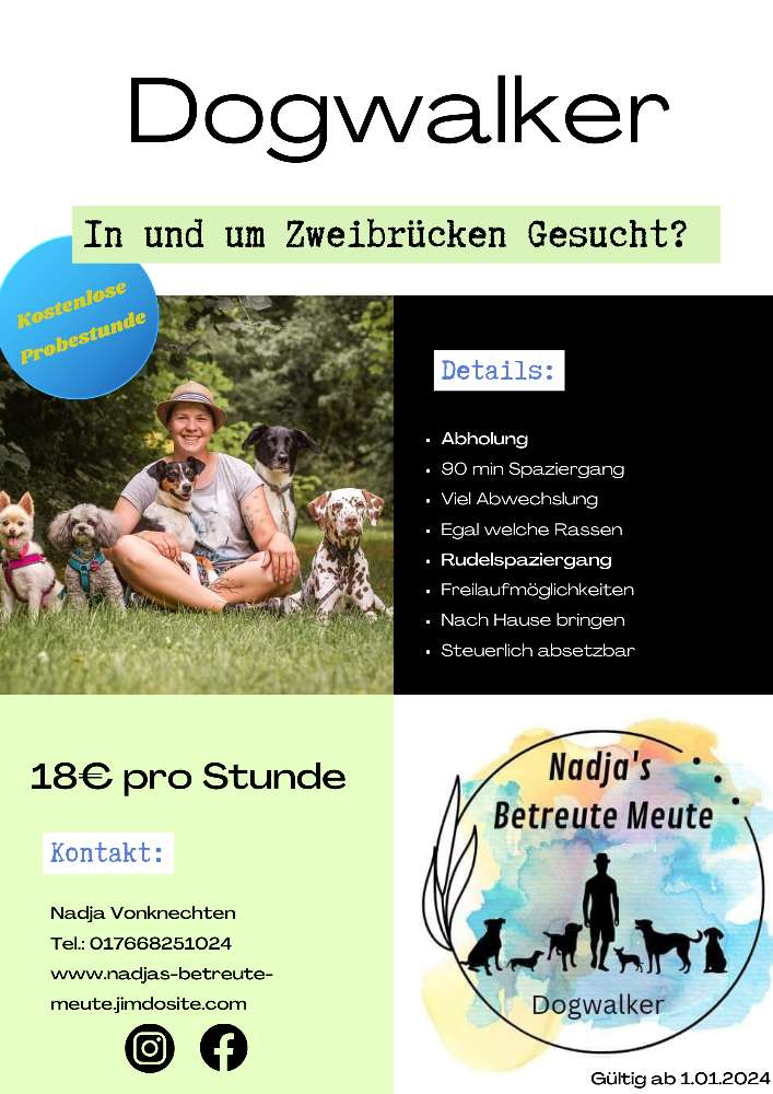 Hi, ich bin Nadja und biete eurem Vierbeiner eine abwechslungsreiche Zeit während ihr zum Beispiel arbeiten seid. Ich nehme euren Liebling auf einen tollen Spaziergang voller Spaß und Abenteuer mit. Nach unserem Ausflug wird euer Hund von mir nach Hause in sein Körbchen gebracht.