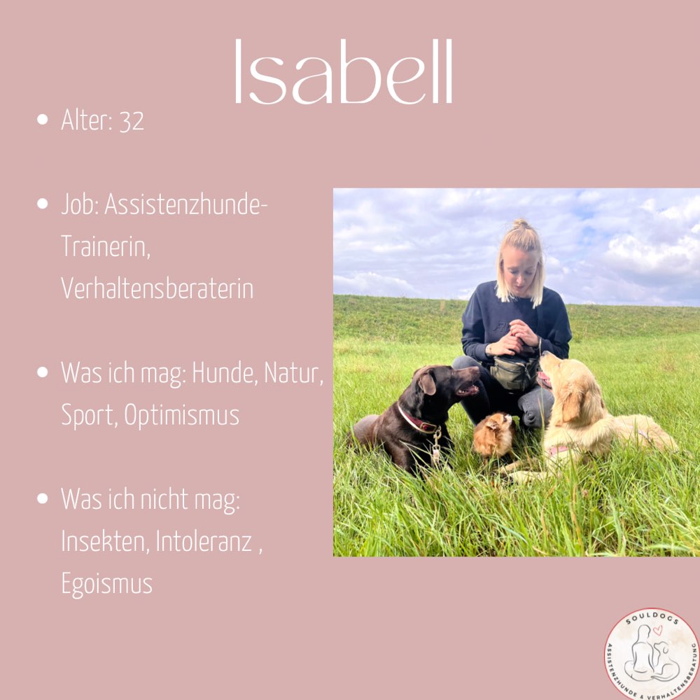 Hi! Ich bin Isabell, Assistenzhunde-Trainerin und Hunde-Verhaltensberaterin und zeige dir die Welt aus den Augen deines Hundes. Ich begleite euch auf dem Weg zu einem entspannten Alltag, in dem ihr euch aufeinander verlassen könnt, ganz viel voneinander lernt und Herausforderungen gemeinsam positiv bewältigt.