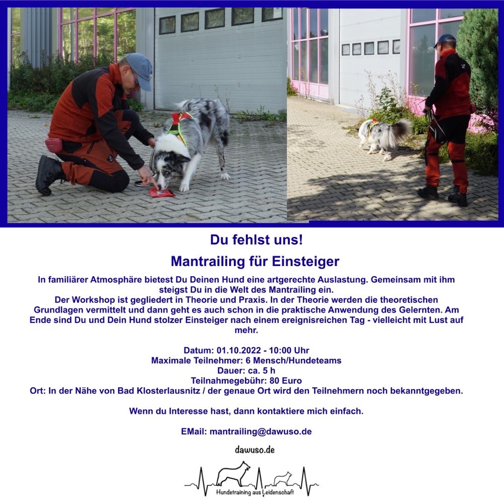 - Mantrailing: Spannende Kurse, in denen Hunde lernen, Personen anhand ihres individuellen Geruches zu finden.