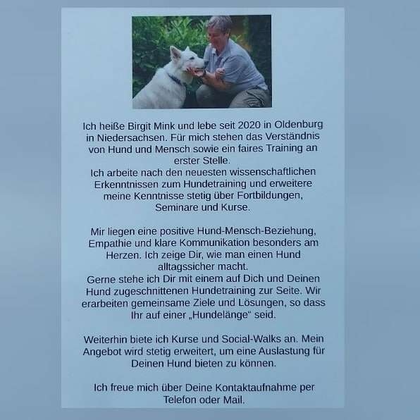 Ich heiße Birgit Mink und lebe seit 2020 in Oldenburg in Niedersachsen. Für mich stehen das Verständnis von Hund und Mensch sowie ein faires Training an erster Stelle. Ich bin selbst Hundehalterin und habe mit meiner Ausbildung zur Hundetrainerin bei Ziemer & Falke meinen Traum verwirklicht. Ich arbeite nach den neuesten wissenschaftlichen Erkenntnissen zum Hundetraining und erweitere meine Kenntnisse stetig über Fortbildungen, Seminare und Kurse. Nach meinem erfolgreichem Abschluss im September 2022 habe ich mich im Bereich Welpentraining (Welpencoach) spezialisiert. Auch meineWeiterbildung zur Verhaltensberaterin habe ich abgeschlossen. . Mir liegen Hund-Mensch-Bindung, Empathie und klare Kommunikation besonders am Herzen."