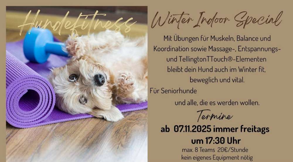 Hundefitnesskurs – Spaß & Action für deinen Vierbeiner! 🐶💪 Mach deinen Hund fit, beweglich und happy! Mit einfachen Übungen für Muskeln, Balance und Koordination, kleinen Stretch- und Entspannungseinheiten stärkst du Muskeln und Bewegungsapparat – ganz ohne Equipment. Perfekt, um gemeinsam Zeit zu verbringen und deinen Hund rundum gesund zu halten.