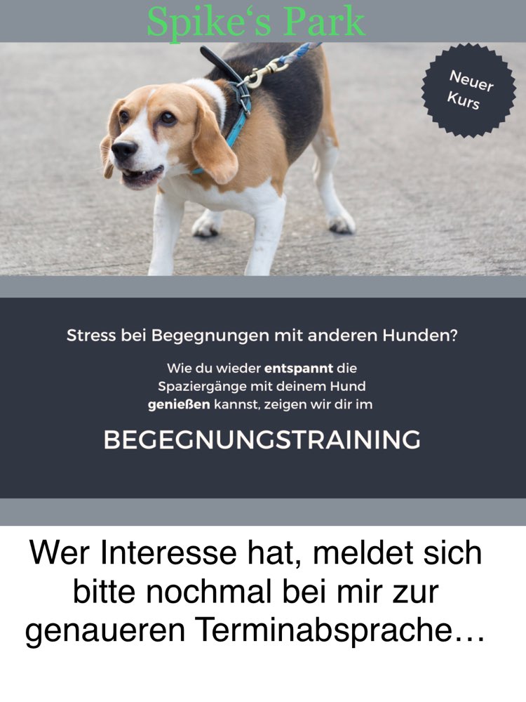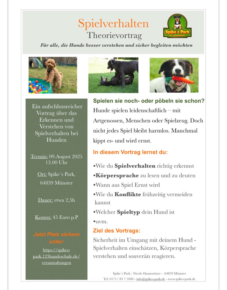 Bei mir wird immer in kleinen Gruppen trainiert, nicht mehr als 6 Mensch-Hund-Teams- die individuelle Betreuung ist mir sehr wichtig - Ob in den Welpen-,Junghund- oder erwachsenen Gruppen. Es gibt neben Einzelstunden und den Grundkursen auch Spezial-Kurse (z.B. Leinenführigkeit, Anti-Giftköder) ebenso wie die offene Gruppe OnLein-Training (an der Leine- mit wechselnden Themen- Beschäftigung, Impulskontrolle, Begegnungen, Social Walks). Zusätzlich gibts auch Workshops (z.B. 1. Hilfe am Hund) und Vorträge. Ach, Krimiwanderungen gibt’s auch immer mal wieder ☺️ Ihr seht- ganz schön was los in Spike’s Park… bei Interesse- einfach melden und wir vereinbaren eine Schnupperstunde 📞