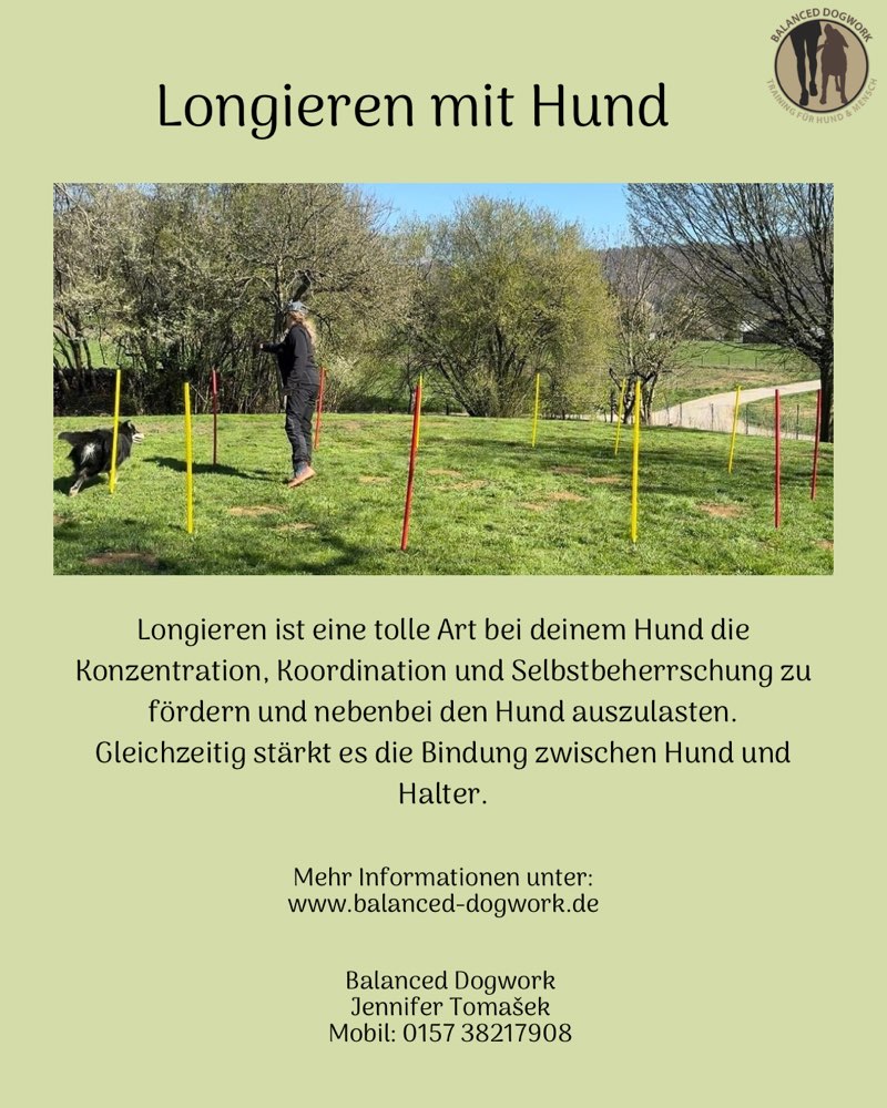 Beim Longieren wird der Hund auf einer Kreisbahn geführt, während der Halter ihn über Körpersprache und Kommandos anleitet. Diese Trainingsform ist sehr gut geeignet um die Konzentration, Koordination und Selbstbeherrschung des Hundes zu fördern. Gleichzeitig wird die Bindung zwischen Hund und Halter gestärkt. In der Gruppe gebe ich individuelle Unterstützung und Tipps, so dass Anfänger und auch Fortgeschrittene gleichermaßen an den Stunden teilnehmen können.