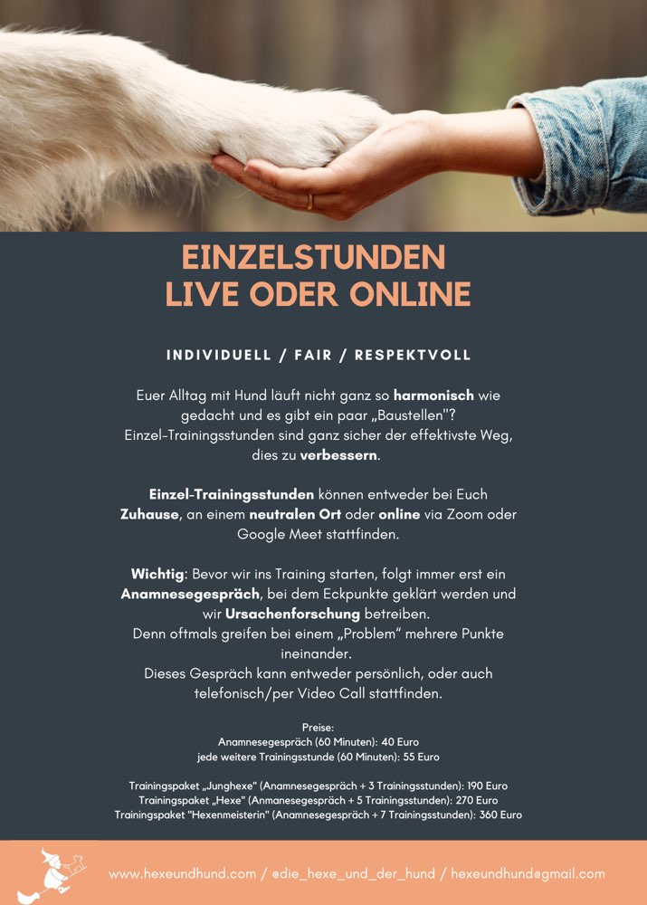 „Die Hexe und der Hund“ bietet Dir modernes, bedürfnisorientiertes Hundetraining, individuell auf jedes Mensch-Hund-Team angepasst. Flexibel planbar, egal ob online, auf der Straße oder bei Dir Zuhause.