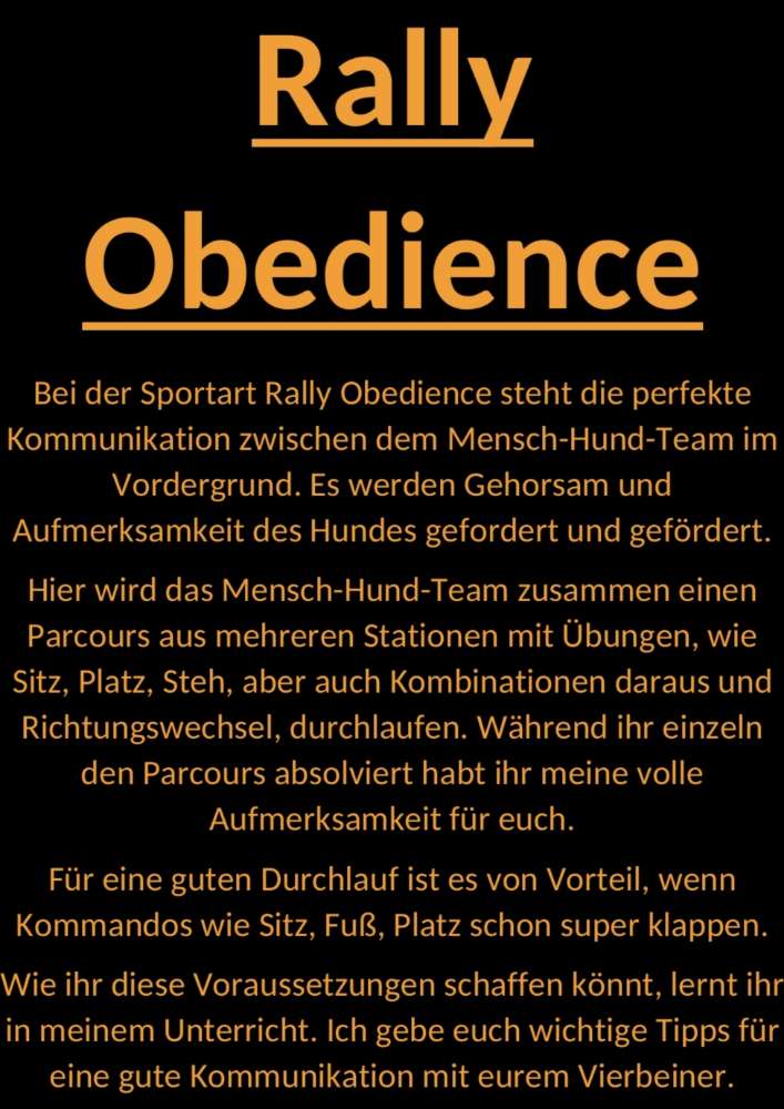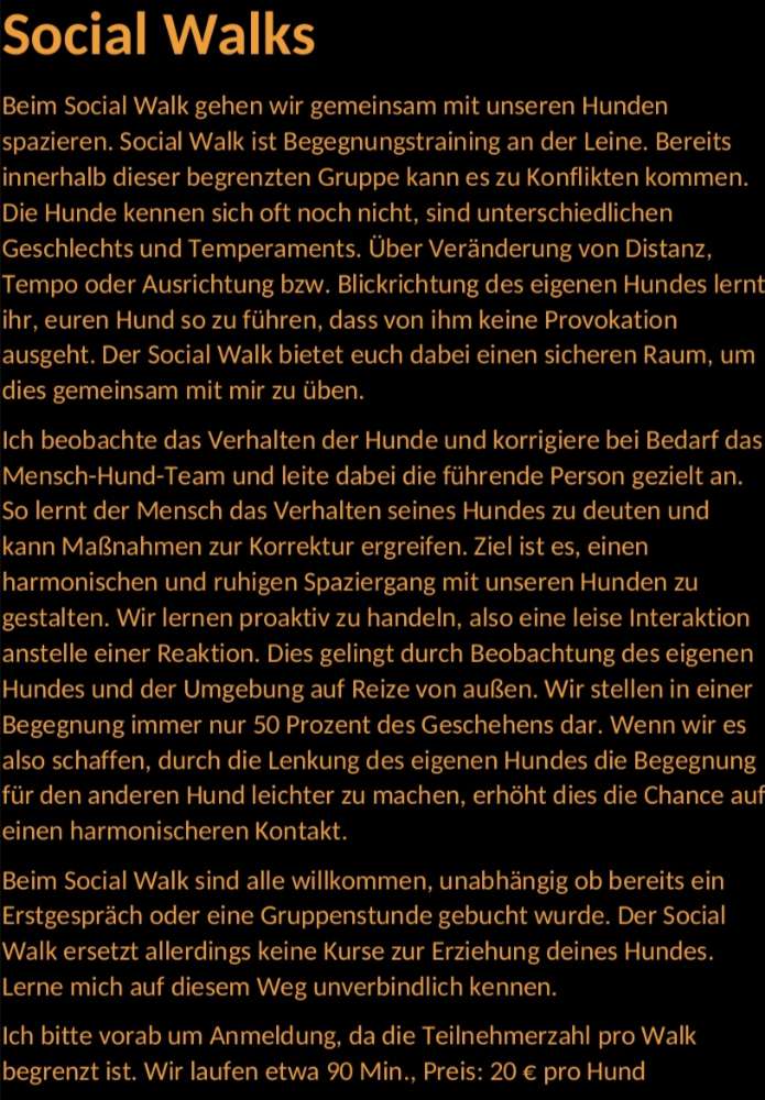 Ich freue mich, wenn ich dir mit einer fachkompetenten und zielführenden Anleitung unterstützend zur Seite stehen darf. Die gemeinsamen Aktivitäten fördern das Selbstvertrauen und stärken die Beziehung zu deinem Hund.