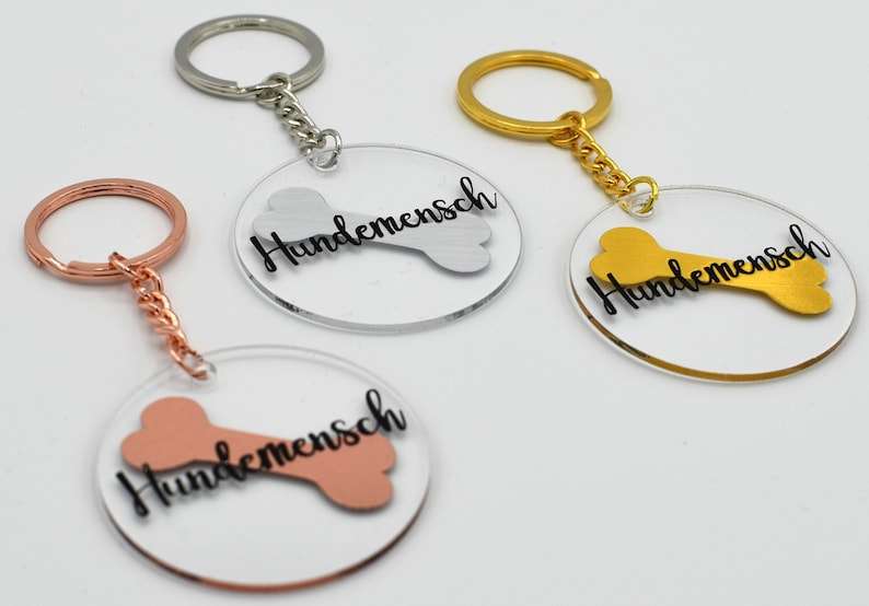 Diese handgemachten Schlüsselanhänger eignen sich wunderbar als kleines Geschenk für Hundeliebhaber. Im Hintergrund ist ein Knochen aus einer metallischen Folie, deren Farbe du dir über die Varianten aussuchen kannst. Darüber kommt der Schriftzug "Hundemensch" in schwarzer Folie. Der Schlüsselanhänger (Metall-Part) ist der Farbe der Folie angepasst.