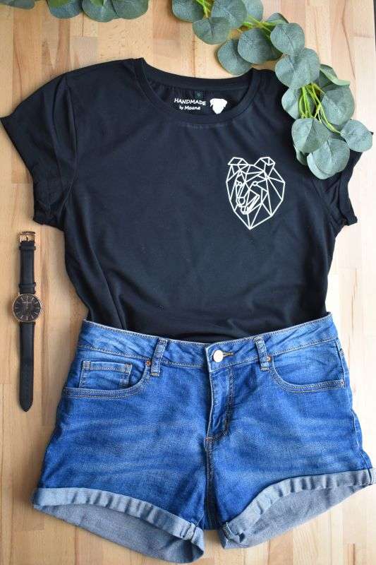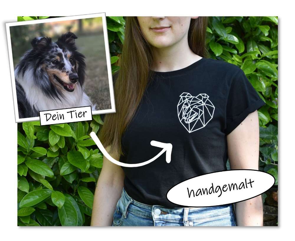 Ich gebe mir größte Mühe, deinen Liebling so zu zeichnen, dass du eine tolle Erinnerung hast. Dazu schickst du mir ganz einfach nach der Bestellung ein gut belichtetes Bild deines Tieres per Mail an die Email-Adresse, die du in der Bestellbestätigung erhältst und ich lege so bald wie möglich los. Schreib mir bitte ebenfalls dazu, ob ich den Namen deines Tieres unter dem Motiv anbringen soll. Dein Motiv zeichne ich von Hand und bringe es mittels einer Bügelpresse auf ein nachhaltiges Shirt aus 100% zertifizierter Biobaumwolle. Das Shirt ist in der Farbe schwarz mit weißem Aufdruck aus Flockfolie. Diese fühlt sich samtig weich an und ist ein absoluter Hingucker. Das Shirt hat einen Damenschnitt und ist durch den leicht abgerundeten Saum und die aufgerollten Ärmel sehr modern.