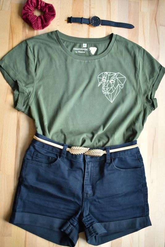 Ich gebe mir größte Mühe, deinen Liebling so zu zeichnen, dass du eine tolle Erinnerung hast. Dazu schickst du mir ganz einfach nach der Bestellung ein gut belichtetes Bild deines Tieres per Mail an die Email-Adresse, die du in der Bestellbestätigung erhältst und ich lege so bald wie möglich los. Schreib mir bitte ebenfalls dazu, ob ich den Namen deines Tieres unter dem Motiv anbringen soll. Dein Motiv zeichne ich von Hand und bringe es mittels einer Bügelpresse auf ein nachhaltiges Shirt aus 100% zertifizierter Biobaumwolle. Das Shirt ist in der Farbe olivgrün mit weißem Aufdruck aus Flockfolie. Diese fühlt sich samtig weich an und ist ein absoluter Hingucker. Das Shirt hat einen Damenschnitt und ist durch den leicht abgerundeten Saum und die aufgerollten Ärmel sehr modern.