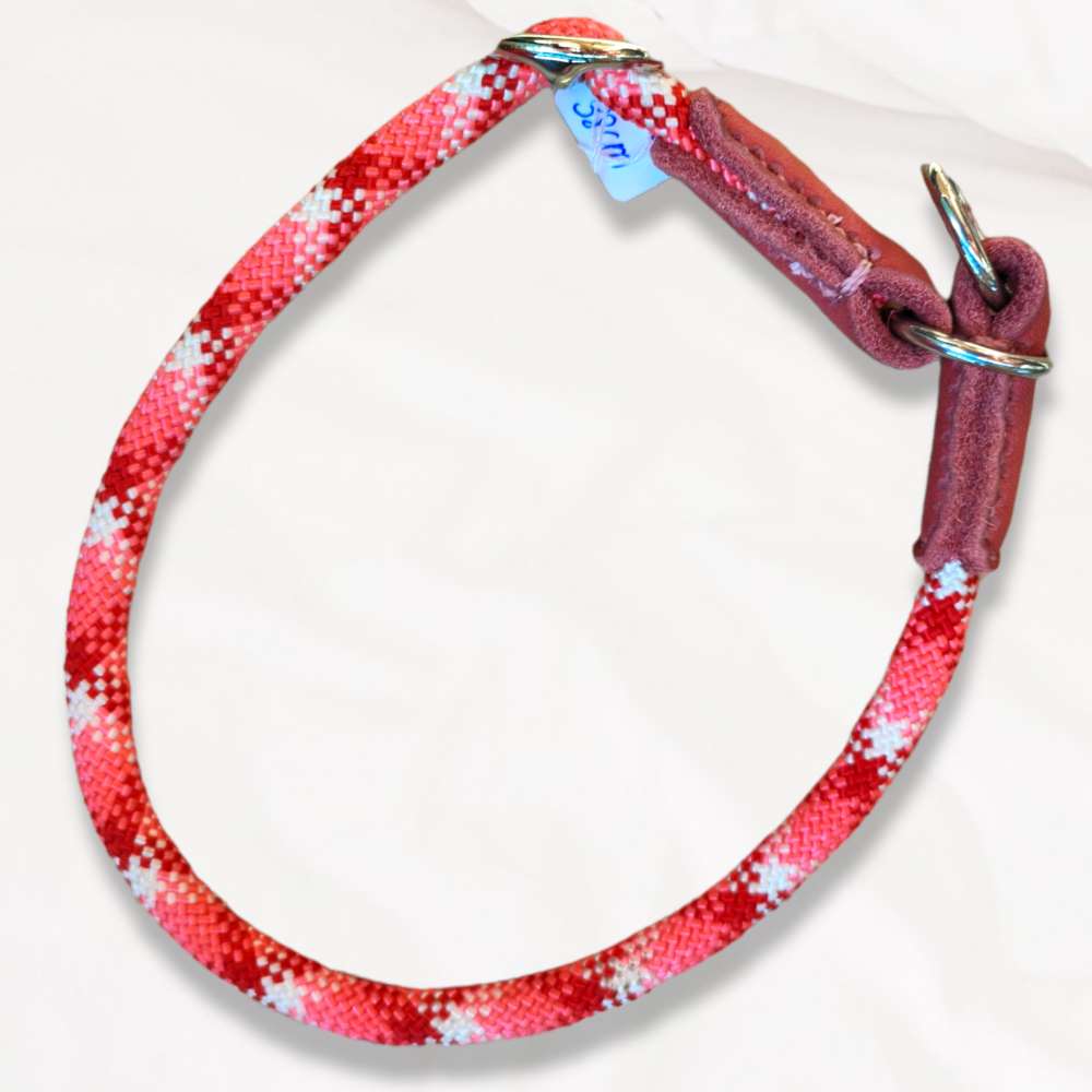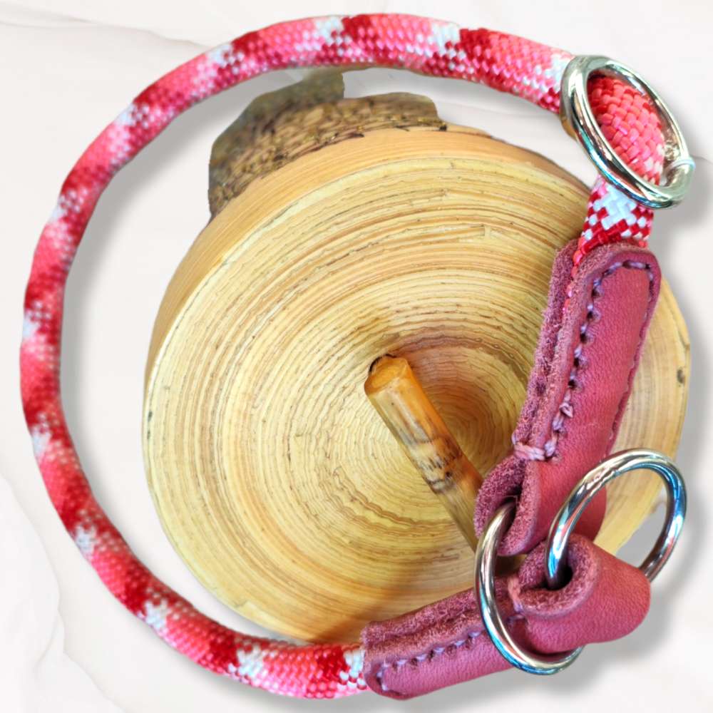 Das Halsband ist aus extrem robustem Kletterseil in weiß, korale und rot mit einer Dicke von ca. 8mm. 💖 Ergänzt ist sie mit wunderschönem, altrosanem Fettleder in 15mm Breite, das ich von Hand genäht habe. Sie ist für einen maximalen Halsumfang von 38 cm geeignet und nach unten gut verstellbar. Die hochwertigen Beschläge sind in silber.