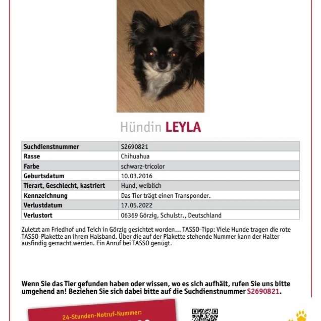 Seid dem 17.05.2022 wird unsere Chihuahua Hündin Leyla in 06369 Görzig schmerzlich vermisst 😭 wer hat sie gesehen oder aufgenommen???