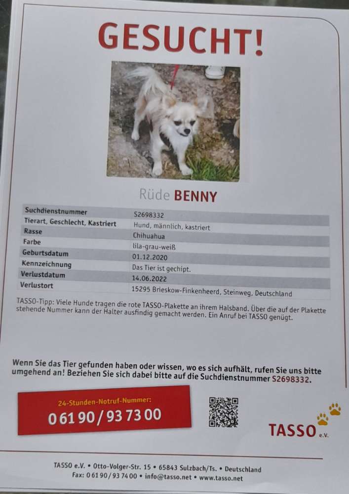 Wir sind aus Rheinland Pfalz und wollten dort Urlaub machen. Benny kennt die Gegend dort nicht ist für ihn Fremd Die Letzte Sichtung von ihm war am 19.06.2022 in den Wiesen und Feldern von 15295 Brieskow Finkenheerd dort Richtung Kuhlitzer Lose/Aurith, Wiesenau, Ziltendorf, Vogelsang. Das sind Ortschaften die in der Umgebung sind und vielleicht auch dort aufgetaucht ist. Hinter den Wiesen kommt auch der Damm da hinter fliesst die Oder. Seit ca. 6 Wochen haben wir keine Sichtung mehr.