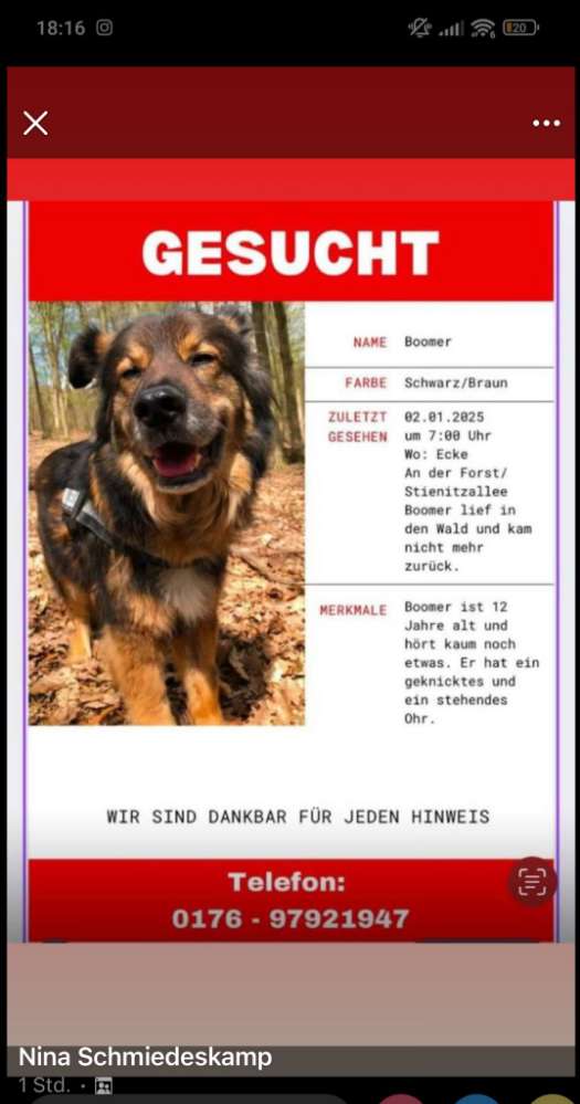 Ich teile nur die Suchanzeige. Boomer ist alt und gebrechlich, hört nicht mehr gut.