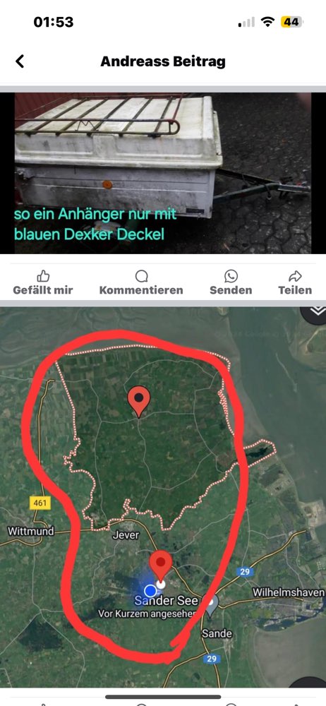 Hellbraunes Zotteliges langes Fell. Super Lieb nur mit Rüden kann er nicht. Ist mit seiner Freundin entwischt oder vom Hof gestohlen worden, da ein alter einaxer Anhänger mit blauen Deckel auch fehlt. Die andere Hündin ist Menschenscheu und hört auf den Namem Laika sie ist eher schwarz. Drohnen Einsätze, tägliche Suchachtionen übers akker Richtung Zetel haben leider nichts ergeben.