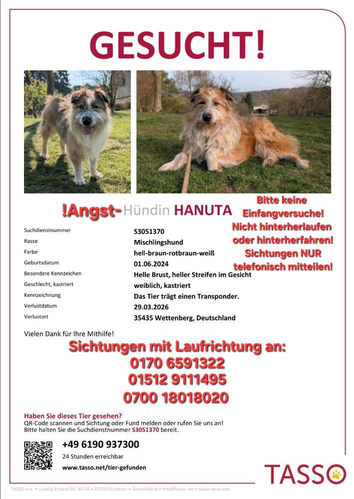 🚨🚨Angsthündin Hanuta ist am 29.03.26 in 35435 Wettenberg-Krofdorf-Gleiberg entlaufen!