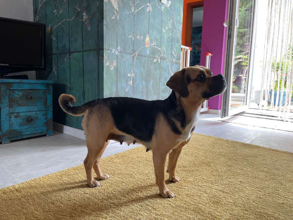 Puggle Rita ist aus der Haustür auf den Breierspfad gelaufen. Sie trägt kein Halsband und ist eher ängstlich, allerdings futterinteressiert.