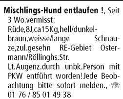 Wer ebenfalls Beobachtungen dieser Art gemacht haben sollte ,oder jemanden kennt ,der seit etwa 2 Wochen einen älteren Hund (siehe Fotoflyer) besitzt ,Gassi geht oder ähnliches , bitten wir höflich ,sich beim Hunde-Suchteam Lünen zu melden.