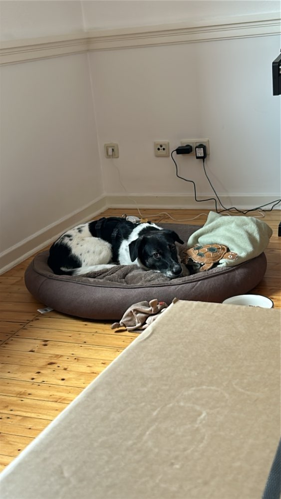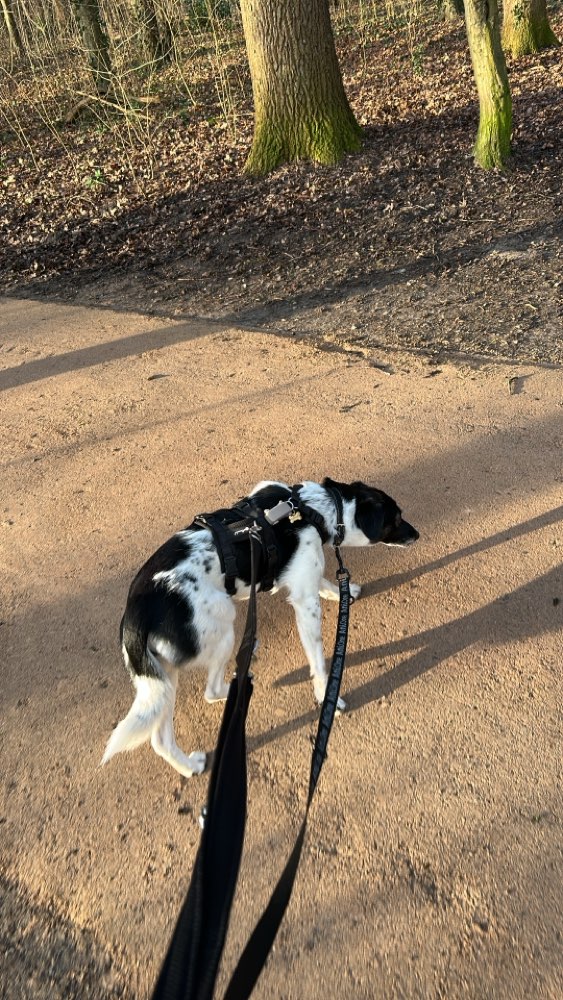 Sie ist aus dem Tierschutz und sehr ängstlich bei Menschen. Sie hatte sich erschrocken und dabei aus ihrem Sicherheitsgeschirr und dem Halsband gelöst. Zara trägt daher nichts. Sie ist ca 45cm groß, 11 Monate alt und hat eine sehr sportliche Figur. Sie hat kurzes schwarz und weiß geflecktes