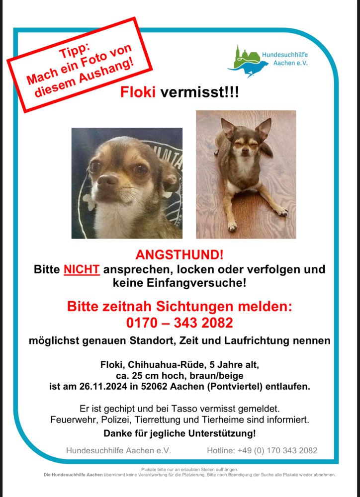 Chihuahua-Rüde Flocki ist am 26.11.24 in Aachen entlaufen.