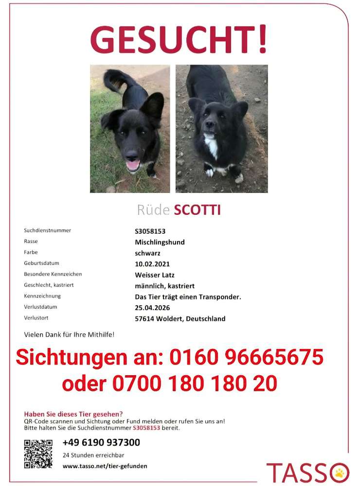🚨🚨Sehr ängstlicher Rüde Scotti ist am 25.04.26 in 57614 Woldert entlaufen!
