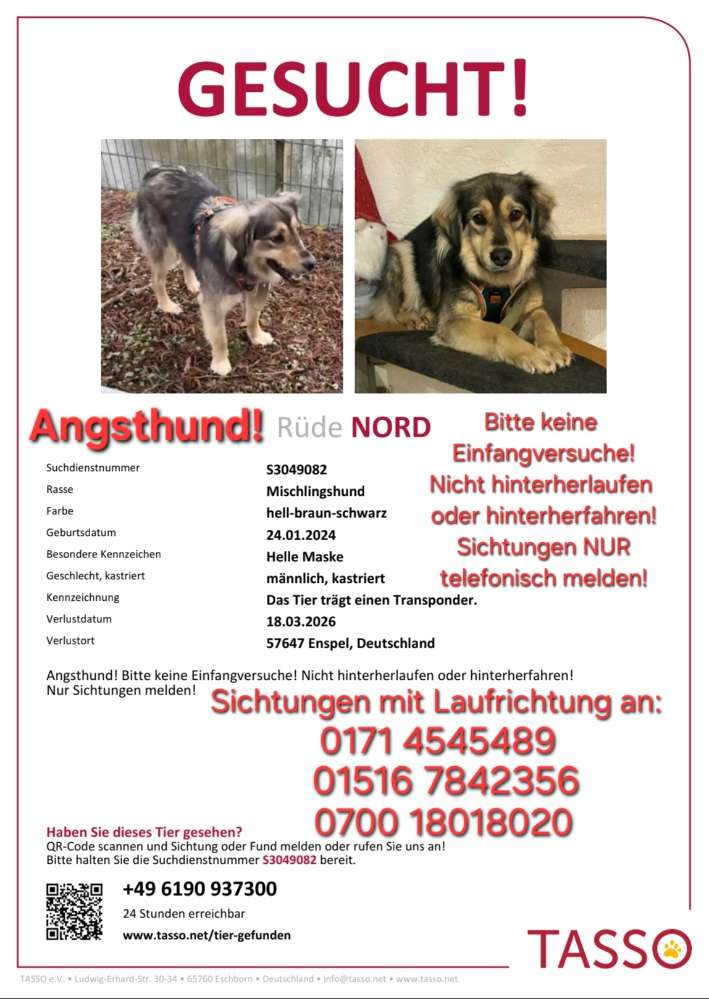 🚨🚨Angsthund Nord ist am 18.03.26 zwischen 57647 Enspel und Nistertal entlaufen!