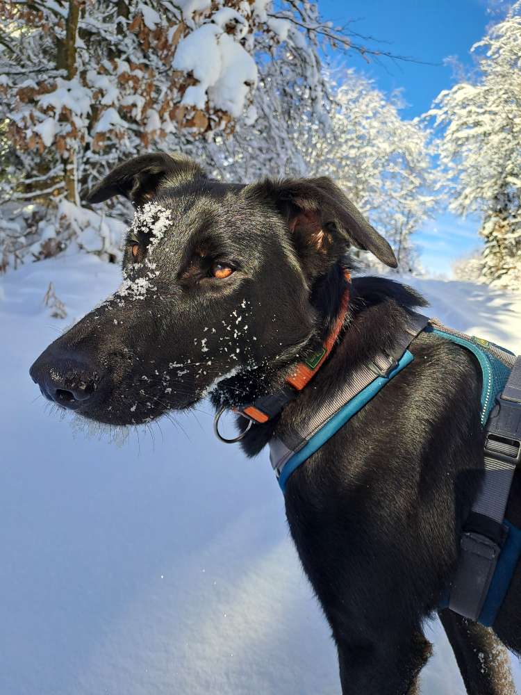 Baldur ist sehr sehr ängstlich und hat einen Stummelschwanz. Er trägt ein Orangenes Halsband und ein Türkisfarbenes Geschirr