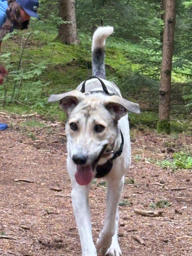 Polly trägt eine Flexi-Leine an ihrem lilafarbenen Anni-X-Geschirr und schleift diese hinter sich her. Dadurch ist sie sehr verschreckt und panisch.
