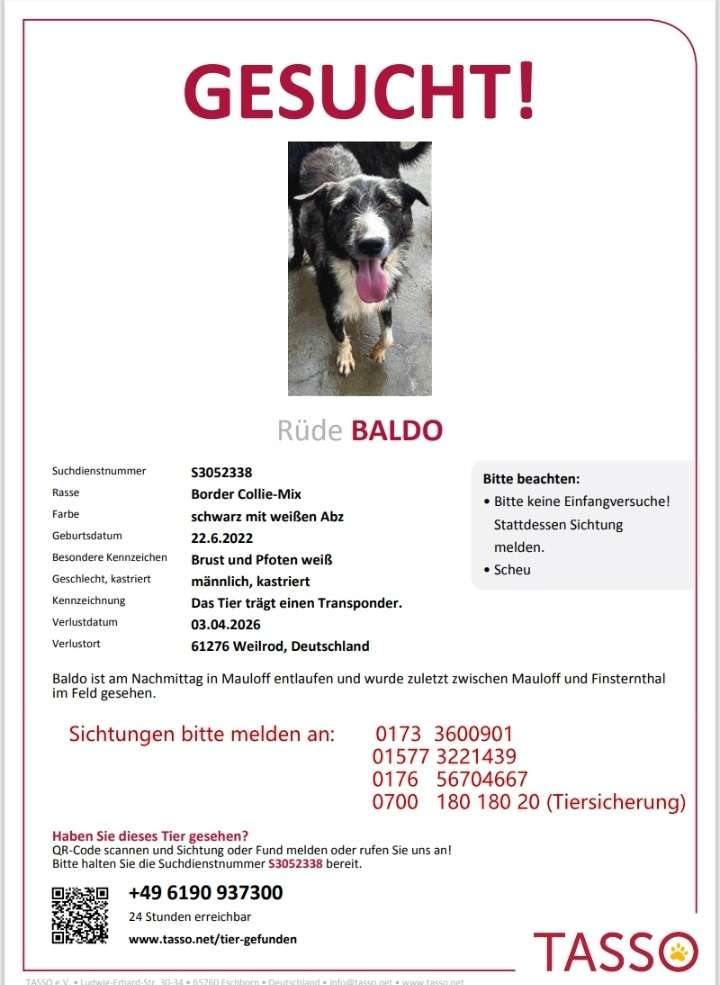 🚨🚨Rüde Baldo ist am 03.04.26 in 61276 Weilrod OT Mauloff entlaufen!