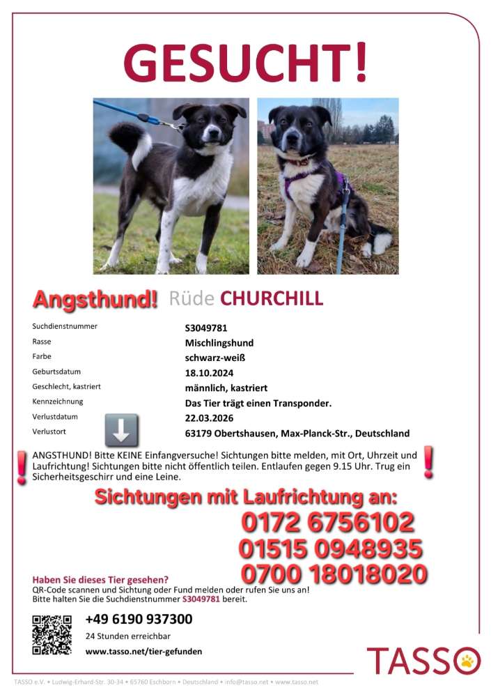 🚨🚨Angsthund Churchill ist am 22.03.26 in 63179 Obertshausen entlaufen!