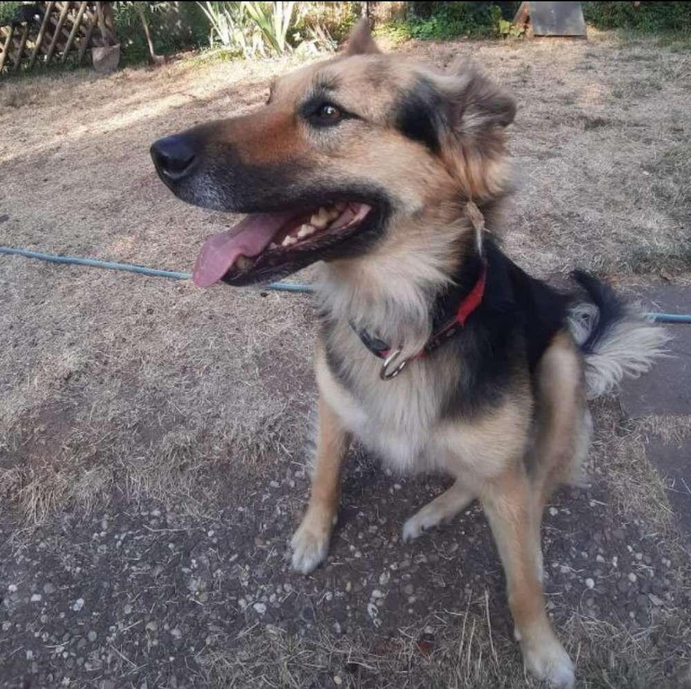 Die Hundin ist schwarz braun beige und hat ein Knickohr.