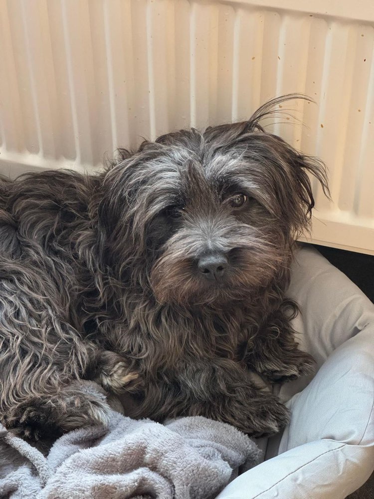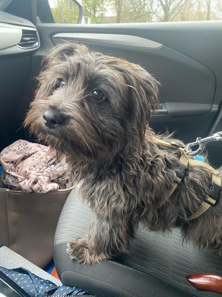 Fussel ist ein kleiner, wuscheliger Mischling (ca. 5 kg), schwarz/grau/braun und trug beim Verschwinden ein pinkes Mäntelchen. Er ist 8 Monate alt, menschenbezogen und freundlich. Er ist gechipt.