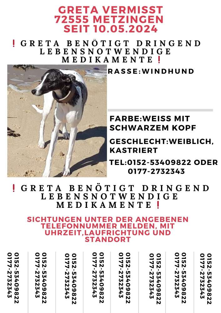 Entlaufen ist Windhündin Greta am 10.5.2024.