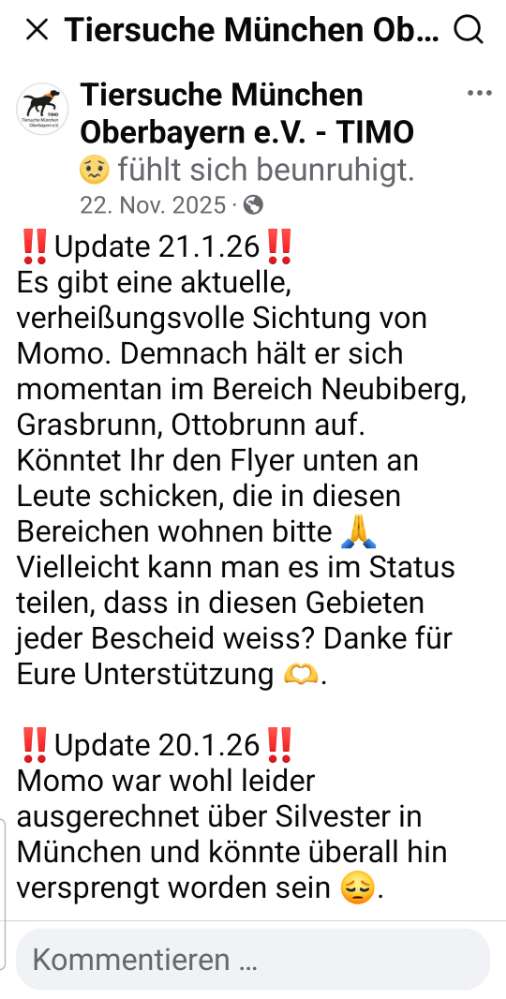 Momo vermisst im Raum 85635 Höhenkirchen-Siegertsbrunn, im Höhenkirchener Forst seit 19.11.2025